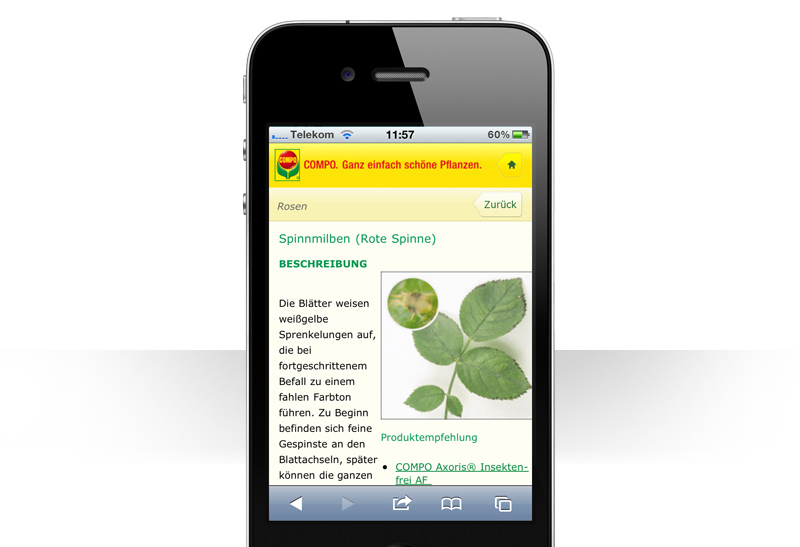 Balkon und Garten werden immer wichtigen für unsere Entspannung. Hier finde ich Ruhe, kann träumen oder ganz abschalten. Brauche ich aber dringend eine Information -"Was sind denn da für Flecken auf den Rosenblättern?", ist es doch ideal, wenn ich nicht erst im Arbeitszimmen den Computer starten muss, sondern vor Ort bequem mit meinem Smartphone oder Tablet PC agieren kann. Deshalb ist die COMPO-Mobile Seite so wertvoll!