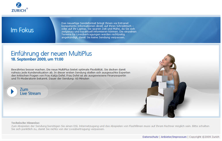 Vor der Markteinführung eines Versicherungs-Produktes müssen die Vermittler, also die Verkaufsmannschaft, umfassend informiert werden. Eine zentrale Veranstaltung bedingt einen immensen Zeit- und Reiseaufwand für die Vermittler. Eine Roadshow ist extrem kostenintensiv. Deshalb hat die Zurich Gruppe ein neues innovatives Präsentations-Produkt konzipiert.