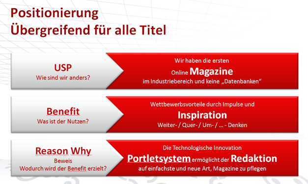Die im Rahmen der Konzeptfindung durchgeführten Workshops und Marktanalysen ergaben zahlreiche konzeptionelle Lösungsansätze. Neben neuen funktionalen Angeboten zeigte sich ein Bedarf im Markt für inspirierende Magazininhalte. Die Hauptkommunikation besteht zwar weiterhin in aktuellen Nachrichten wie Produktmeldungen und Unternehmensmeldungen. Darüber hinaus fehlt jedoch ein Format, welches Branchenimpulse setzt und immer wieder spannende und überraschende Inhalte liefert – eben „Onlinemagazin“.