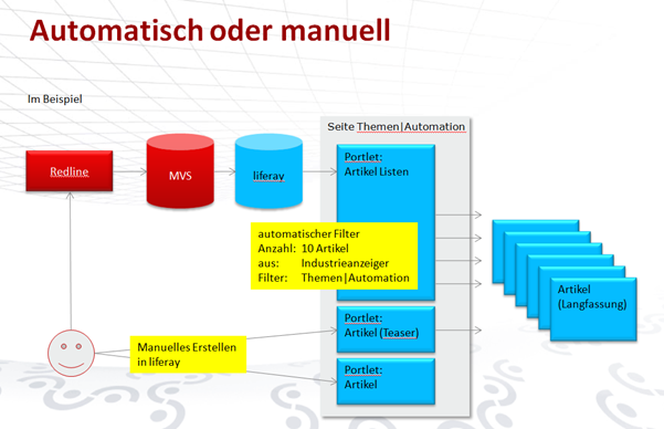 Liferay wurde mit einer sehr leistungsfähigen Importschnittstelle ausgestattet, die strukturierten Content per XML direkt in das eigenen Repository einließt. Dadurch konnte das bereits existierende Redaktionssystem vollständig angebunden werden. 80% des Contents kommt automatisiert auf die Seiten. 20% werden individuell von Hand in liferay gestaltet. Dieses Verhältnis hat sich unter dem Aspekt Aufwand/Nutzen maximal bewährt.