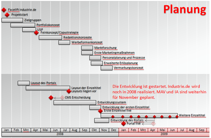 Die Entwicklungszeit betrug ein knappes Jahr. Dieser Zeitraum umfasst alle relevanten Tätigkeiten von Konzept bis Betrieb: Systemprogrammierung liferay, Designentwicklung der Einzeltitel, Implementierung der Templates. Der Rollout der einzelnen Onlinemagazine fand in enger Zusammenarbeit mit den Redaktionen über das Jahr 2009 verteilt statt.