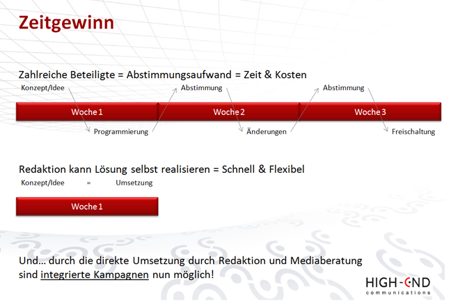 Eine wesentliche Erlösquelle des Verlages ist die Erstellung kundenspezifischer Microsites und Sonderwerbeformate. Deren Herstellung und Integration sind in der Regel zeit- und kostenintensiv. Das liferay System erlaubt hier eine schnelle und nahezu kostenfreie Realisierung. Dadurch können gute Konditionen für die Kunden angeboten werden. Das bringt dem Verlag einen Wettbewerbsvorteil und einen höheren Profit.