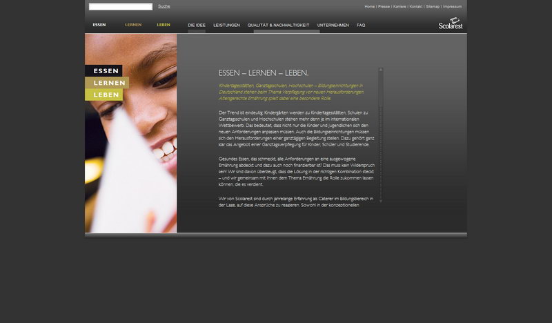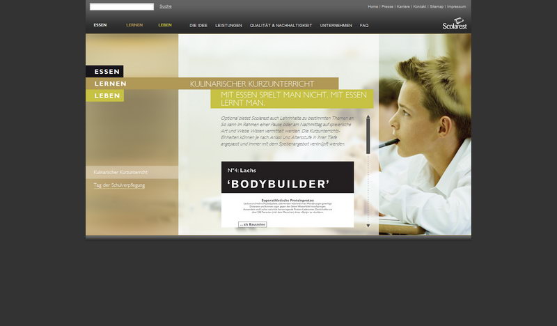 Unsere Partneragentur BrandFactory hat für Scolarest ein einheitliches Konzept für den Printbereich sowohl als auch für das Web entwickelt. Eine zielgruppengerechte Ansprache in der das Scolarest Konzept über eine starke Bildwelt einen emotionalen Zugang zu dem Thema Lebensmittel, Catering und Essen erreichen möchte.